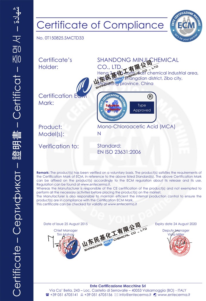 經(jīng)過歐盟CE認(rèn)證 用于制造羧甲基纖維素(CMC) 2.在制藥工業(yè)上用于制取合成咖啡堿、腎上腺素、氨基醋酸、維生素B6、金霉素等中間體 3.在農(nóng)藥工業(yè)中,用于生產(chǎn)農(nóng)藥中間體NAA,2,4-D除草劑等 4.在染料工業(yè)中,用于生產(chǎn)乙酸和氨基乙酸